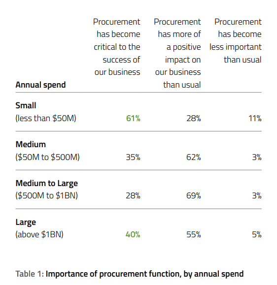 For 95% of participants, procurement has had a more positive impact than usual and for 42% it has become critical to the success of their business. We found that for almost two in three small organisations, procurement is now critical to their business success (61%). Table 1 also shows that 40% of very large organisations said that procurement has become critical.