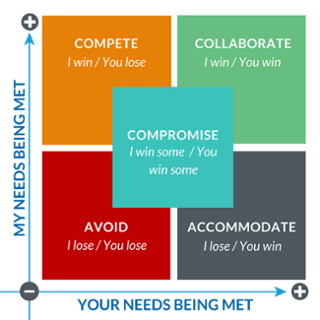 - Compete: Wants to have all their needs met and doesn’t care about yours (usually associated with limited resources). Won’t care about relationships or ongoing business. They win, you lose.