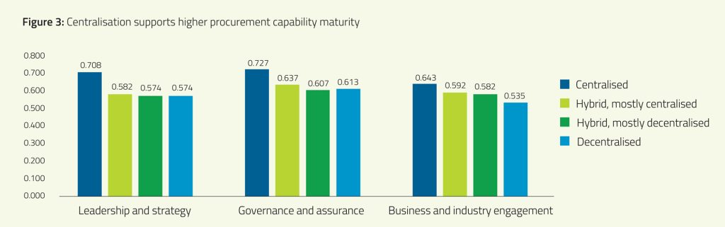 The data shows that organisations with a centralised procurement model achieve the highest scores across all three key capabilities: