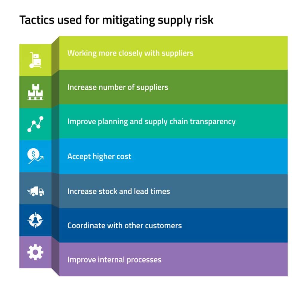 Another piece of the puzzle was to improve planning, often having joint demand planning meetings with suppliers and seeking their assurances that demand can be met. Increasing stock levels and accepting longer lead times are further standard responses to mitigating supply risk.