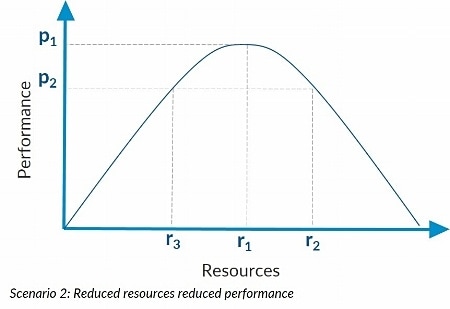 In reality, the performance curve is actually more a like bell curve. Given this, more resources can actually harm performance.