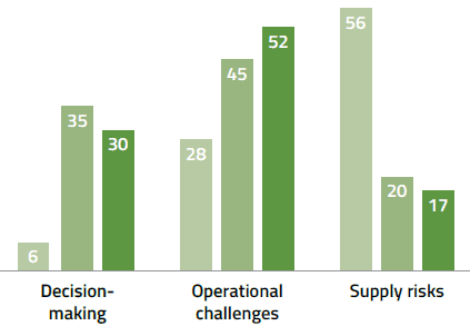 Decision making in public sector organisations has quickly become the second biggest challenge. In April, supply was the biggest struggle for 56% of public sector procurement teams. This reduced significantly to 17% by September. Conversely, operational challenges came to the fore, escalating dramatically. For government, operational concerns associated with working in a virtual environment were already significant in April (28%) and escalated to 52% by September 2020.