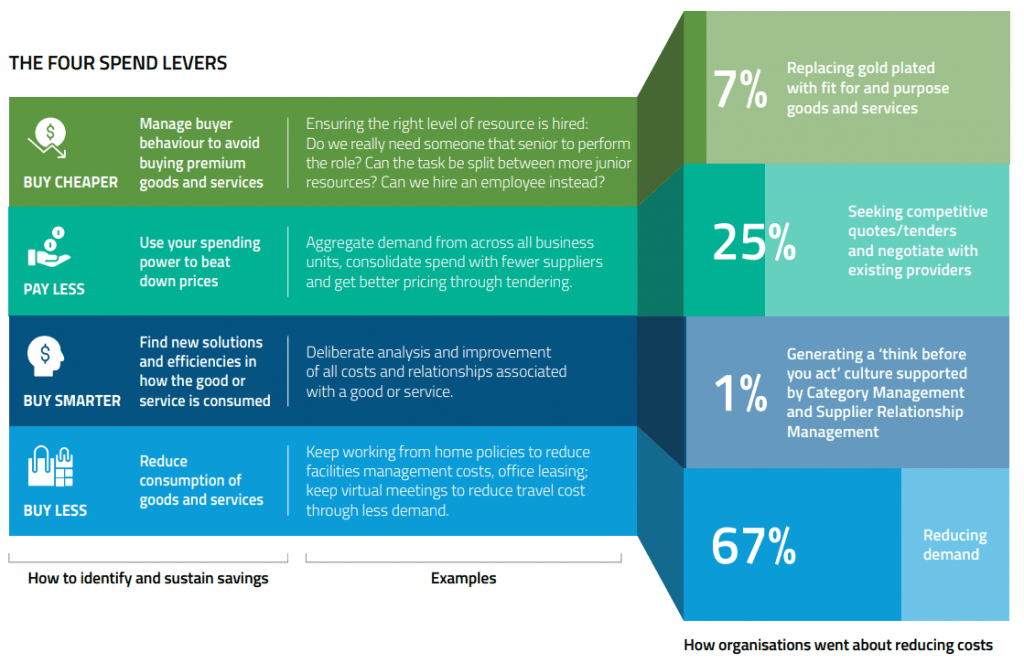 Procurement professionals have four spend levers in their toolbox. From previous research into procurement savings we know that Buy Less (reducing demand) is most effective in reducing cost, closely followed by Buy Cheaper (buying fit for purpose rather than gold-plated goods and services). More traditional approaches, like using spending power to drive down prices (Pay Less), generally don’t work as well as they used to. Buying Smarter is often about improving the way the business operates, which hasn’t received much attention since the start of the pandemic.
