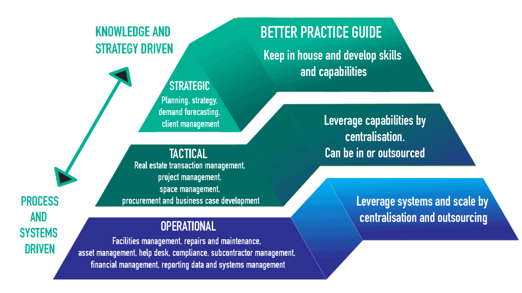 In the model below we map out the typical property and facility management services against a continuum that assesses process and data driven transactions to knowledge driven transactions.