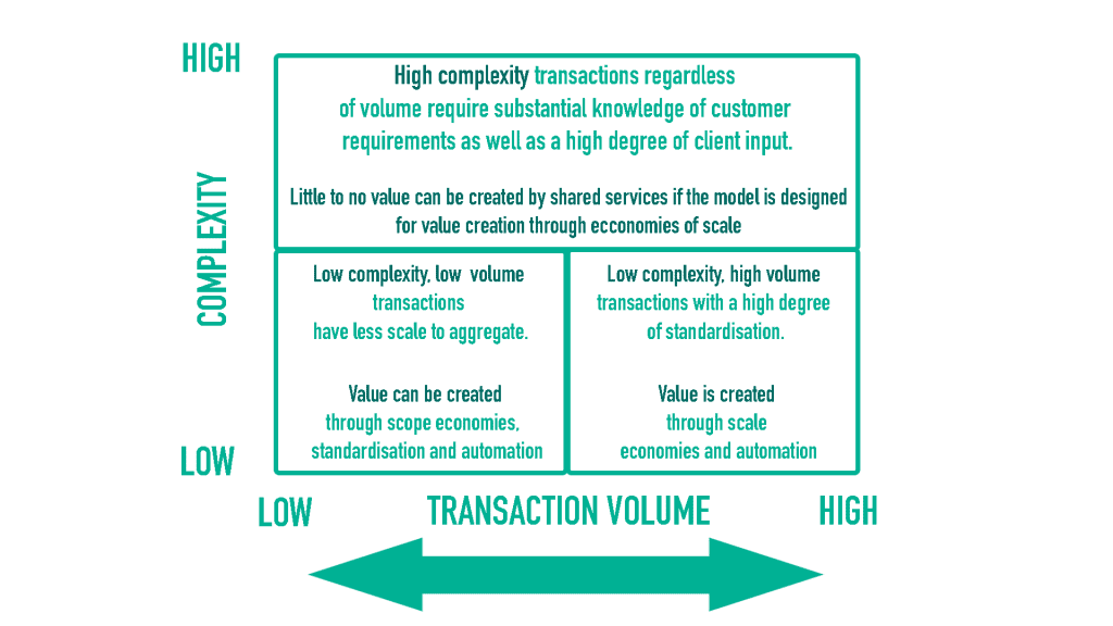 Value can be created just as much as value can be destroyed in a shared services model where economies of scale are considered the be all and end all. For property and facilities management, a design including an understanding of complexity and transaction volume is essential.