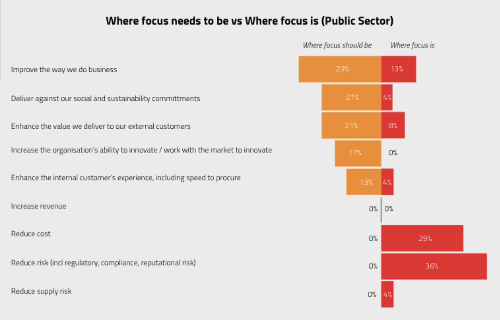 - Risk reduction (regulatory, compliance, reputational and supply risk) was by far the most important focus for public sector teams (42% of where the focus is today)