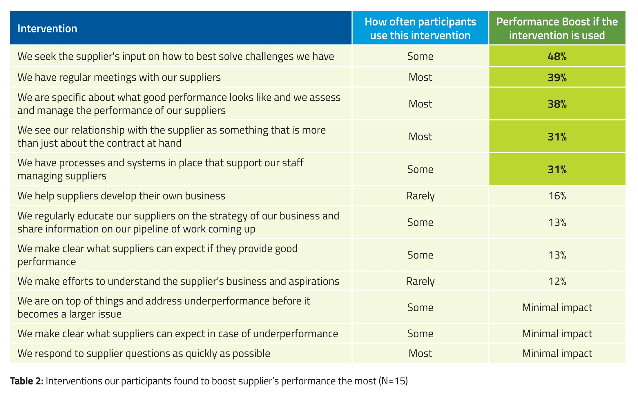 The research participants in general found that the more avenues to influence the performance of their service providers they use, the better the performance. Those participants who achieved good performance used on average eight interventions, those who received acceptable or underperformance used only five interventions.