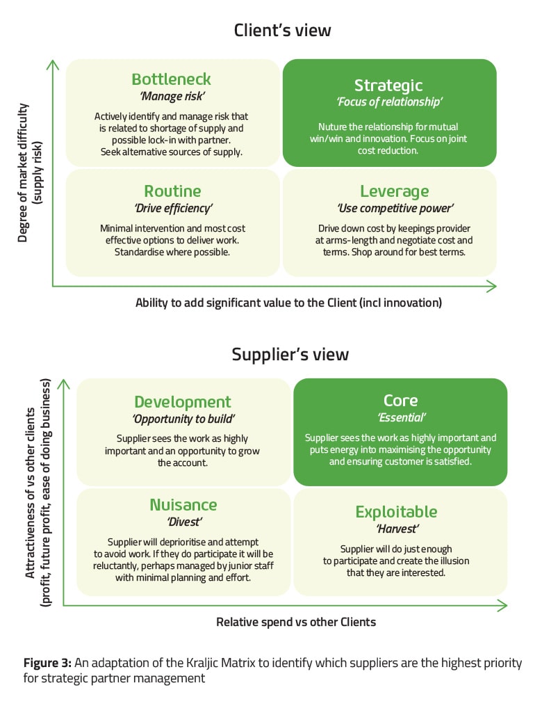 We recommend clients use the Kraljic Matrix (refer Figure 3) to identify if a supplier relationship is suitable to Strategic Partner Management. The importance here is also to consider the supplier’s perspective. Only if they consider the client’s business as Core to their own business will Strategic Partner Management be successful. Organisations who have successfully implemented Strategic Partner Management have invested significantly into those suppliers that fall into the ‘Strategic’ quadrant and they themselves fall into the ‘Core’ quadrant for the supplier. They have implemented detailed and active management, with significant effort in developing and nurturing the relationship across both organisations. They focus on initiatives which result in win/win, innovation, and joint cost reduction.