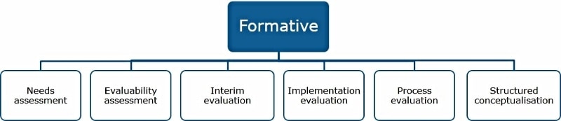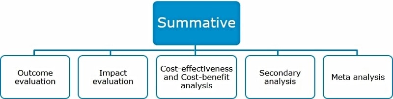 Typically occurs at the end of a program with a retrospective and holistic scope that assesses all program aspects including delivery, activities, impacts and outcomes. This form of evaluation helps make judgements of the program’s overall success in terms of its:
