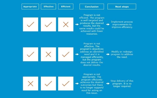 As with so many things, the best way to understand program evaluation is to understand its purpose, which is to inform decisions about a program’s future, by evaluating its appropriateness, effectiveness and efficiency.