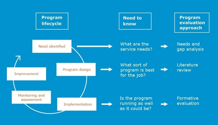 Put simply, program evaluation helps you assess the effectiveness, efficiency and appropriateness of a program, to inform evidence-based decision-making about its future. Program evaluation uses a range of different approaches and can be undertaken at any stage of a program’s lifecycle.