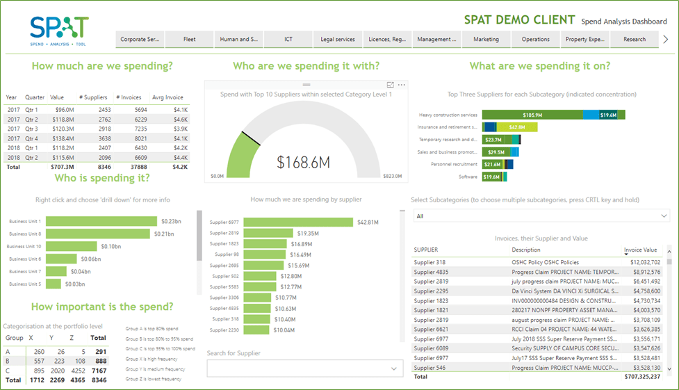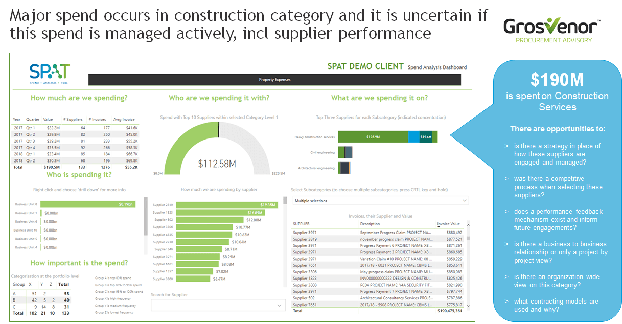 A good start is to ask about each subcategory or even each of the top 10 suppliers in a subcategory the questions in the green speech bubble in the picture above. Further questions flow from looking at your spend dashboards, as shown in the blue speech bubble below: