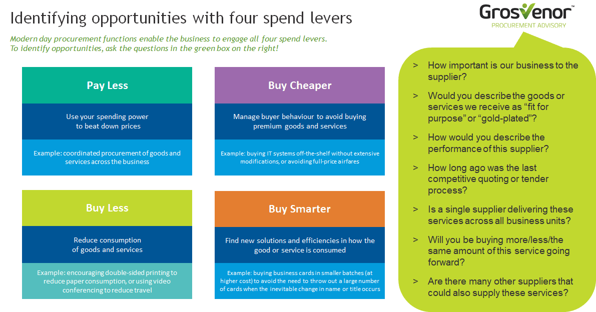 It’s about finding the right commercial models, aggregating the right spend (Pay Less), buying fit for purpose instead of gold-plated (Buy Cheaper), demand management (Buy Less) and process efficiencies (Buy Smarter). Great spend dashboards are a necessary tool for that, but they are not sufficient to identifying where procurement’s quick wins are. Good old experience is required. So how do we go about it?