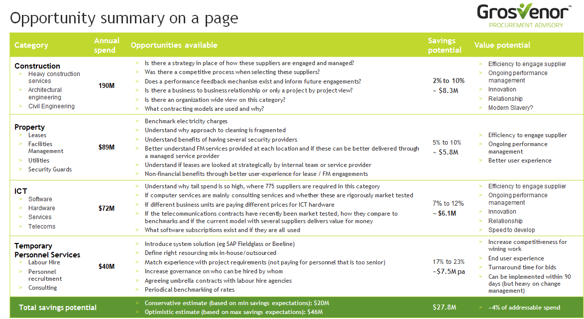 Pull it all together into a single slide. What can be done in the top four or five spend categories and what is the likely financial impact? And of course the additional value that can be created along the way. And here it is, your roadmap for quick wins!