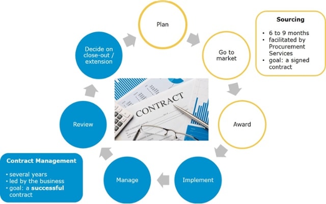 Following the Sourcing phase, contract management is the stage of the procurement cycle during which the goods and services are delivered in a manner that satisfies the requirement stated in the Request for Tender or agreed Statement of Work.