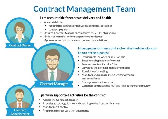 The contract manager is like the Vice-Captain of the team. In short, the contract manager is responsible for managing the day-to-day activities and other players associated with delivering a contract.