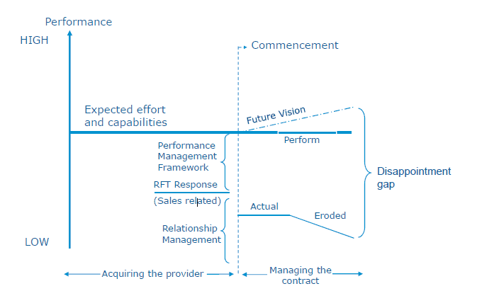 Further disappointment is frequently reported after contract commencement, as the client contract managers come to realise the promised performance of the service provider is not reflected in the actual delivery. Their experience can be further exacerbated by failure of both parties to achieve mutually beneficial contract management relationships.
